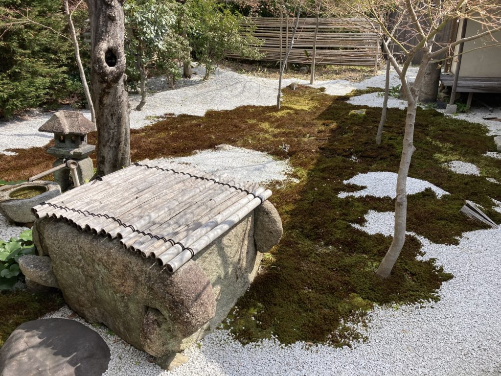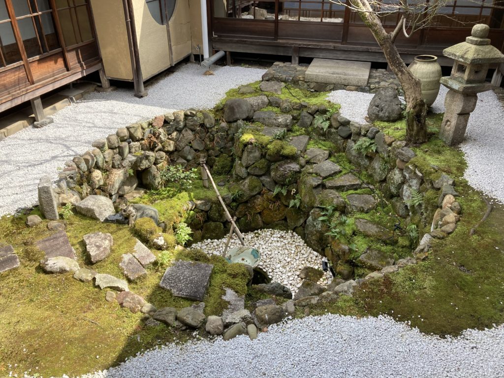 蹲踞とは茶室に入る前に身を清める手水鉢のある場所です。興聖寺の蹲踞は通常よりも深く、螺旋状に階段を降りて行く独特のスタイルになっていてとても珍しいものです。