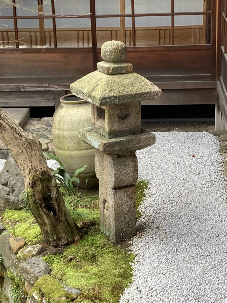 蹲踞の脇にあるのが織部灯籠(おりべどうろう)です。特徴としては台座がなく地面に突き刺さってます。
