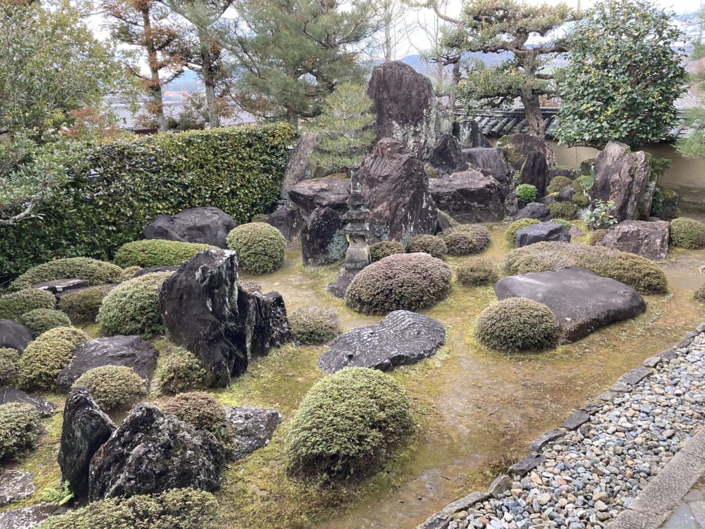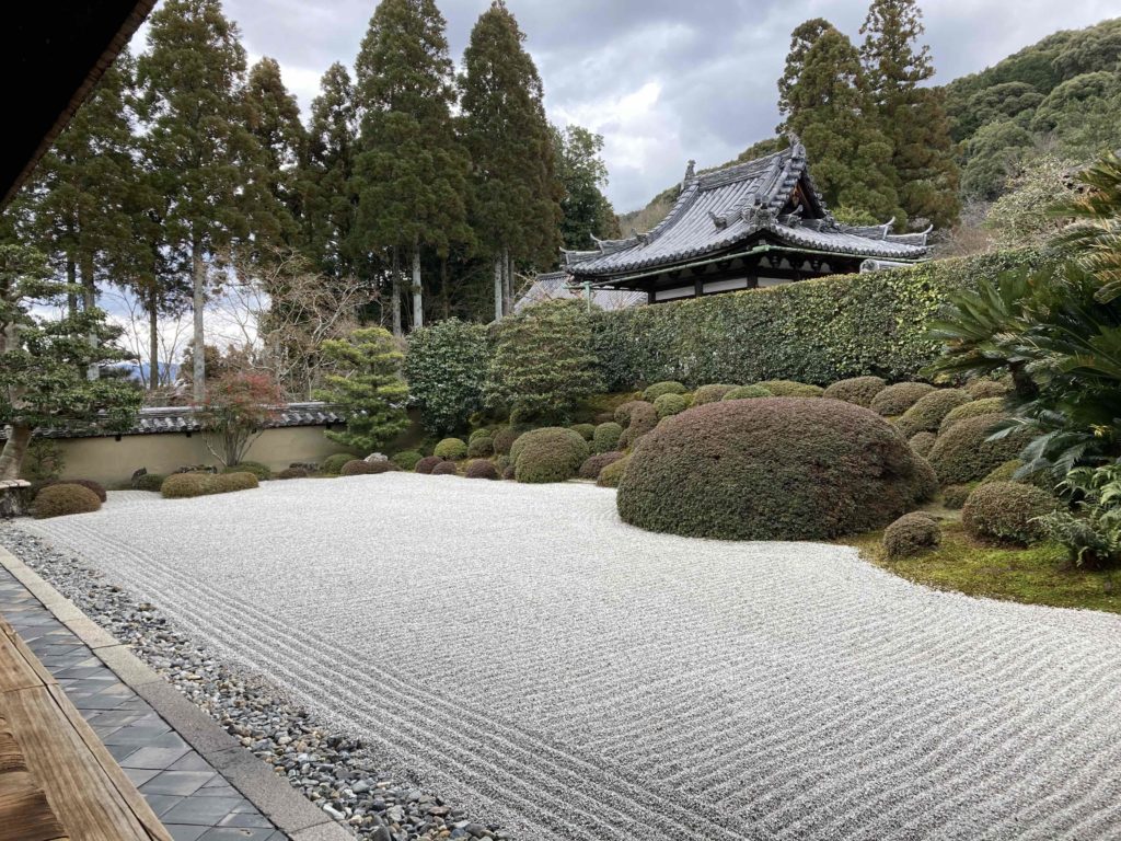 方丈の枯山水庭園は水を使わず石や砂で自然を表現しています。枯山水は、臨済宗など禅宗寺院で発達しました。京都では龍安寺が有名ですが、龍安寺も臨済宗妙心寺派の塔頭(たっちゅう)寺院です。(塔頭とは、大寺院の高僧が引退してから、お寺の近くや境内に小院を建てて住んだお寺で、妙心寺の塔頭は46ヶ寺あります。)