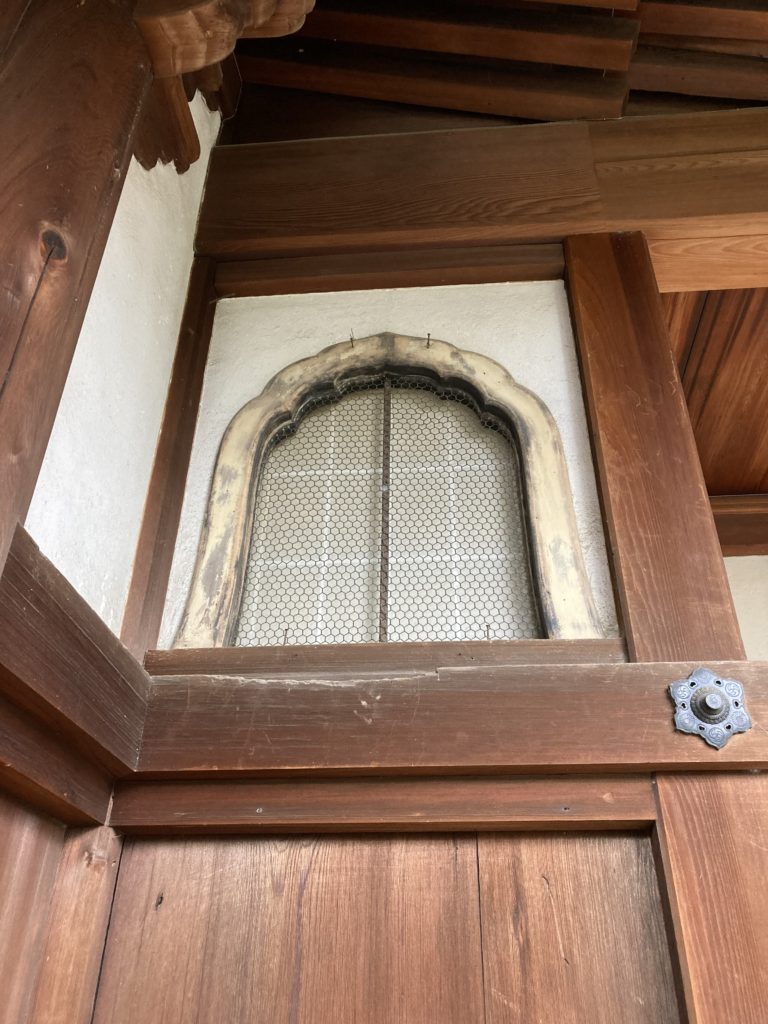 本堂の花頭窓です。主に日本の寺社建築に多くみられる窓で、昔は火灯窓と書いていましたが木造建築に「火」の文字が縁起が悪いということで花頭窓と書くようになったとか。